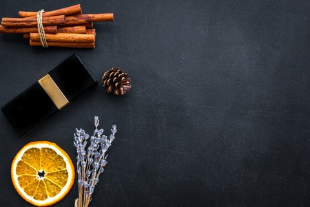 Fruity perfume for women. Bottle of perfume near orange, lavender, cinnamon on black background top view space for text border