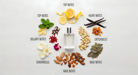 Beautiful collage with photos of luxury perfume and ingredients represent their fragrance notes on light background, top view. banner design