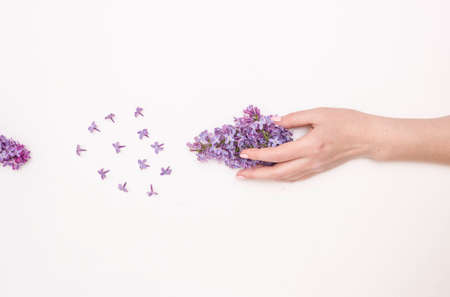 Concept of hand care, anti-wrinkle, anti-aging cream, Spa. Beautiful female hands with lilac flowers on a white background, top view.