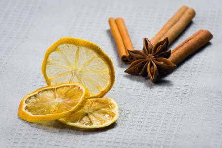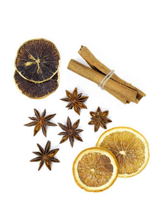 Star anise, cinnamon sticks and dry citrus fruits on a white background. Mulled wine seasoning top view. Fragrant dry spices for making drinks.