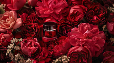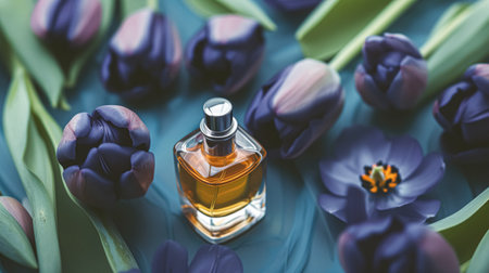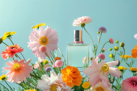 A minimalistic perfume bottle surrounded by vibrant flowers against a serene blue backdrop, capturing elegance and freshness. Perfect for lifestyle inspiration. Generated A.I.