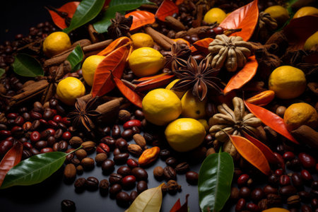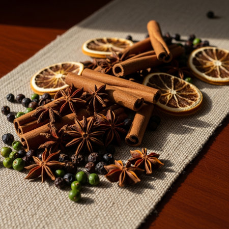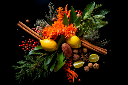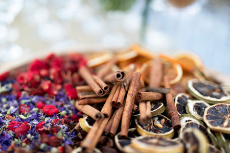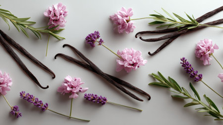 A captivating arrangement of fragrant spices and fresh flowers. Cinnamon sticks, star anise, and cloves mingle with lavender sprigs and rose petals on a warm wooden surface.