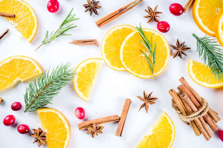 Winter autumn drink and food ingredients. Cranberries, sliced oranges, cinnamon, rosemary, anise for cooking cocktails, with christmas tree branches. Flatlay on white background. Top view copy space