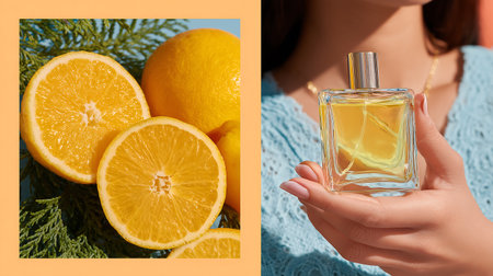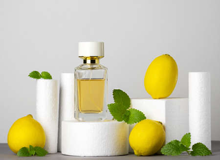 Jar of perfume, lemons and mint leaves. Beauty concept, modern still life.