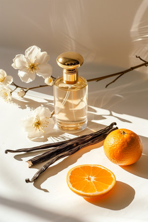 A bottle of perfume is on a table with some orange and vanilla scented items. The bottle is gold and has a gold top