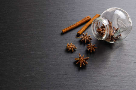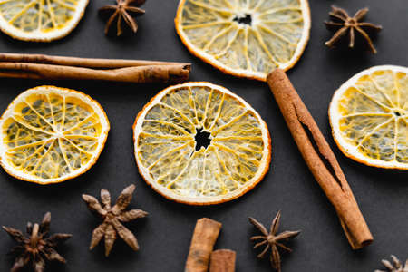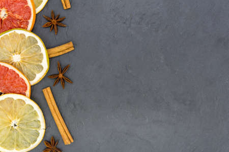 Dried citrus slices and various aromatic spices on black slate with copy space