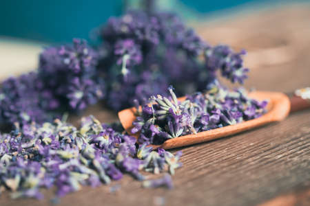 Wooden scoop of fresh lavender flowers on wooden rustic table. Aromatherapy, spa, massage concept.