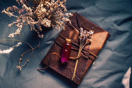 Overhead image of a glass stopper bottle with pink liquid, dried lavender on a leather-bound book on a gray surface