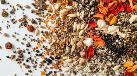 Explore a vibrant assortment of dried plants captured from a top down view. This beautiful arrangement showcases various herbs, spices, and petals, perfect for culinary uses or decorative purposes.