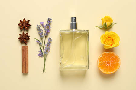 Flat lay composition with bottle of perfume and fresh citrus fruit on beige background