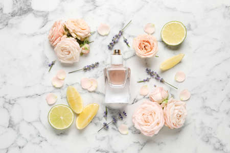 Flat lay composition with bottle of perfume and fresh citrus fruits on white marble table