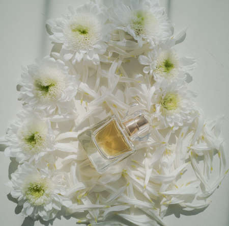 Eau de parfum for women among flowers of white chrysanthemums, flat lay. Vertical photo.