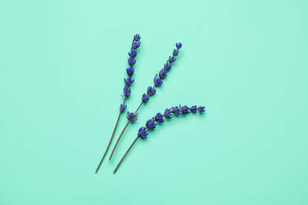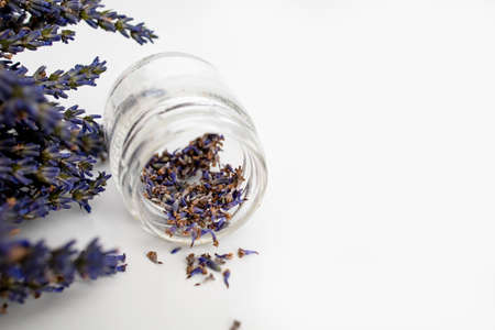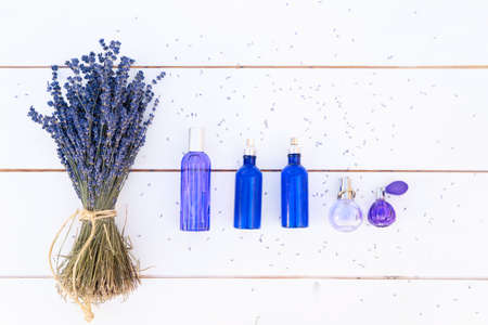 Concept spa therapy. Fresh lavender blossoms with Natural handmade lavender oil, sea salt. Selective focus.