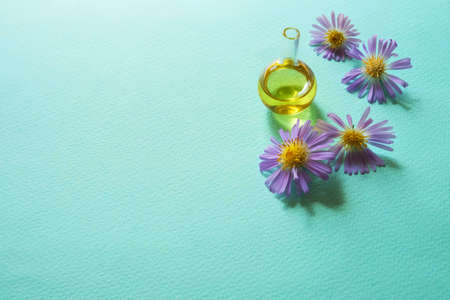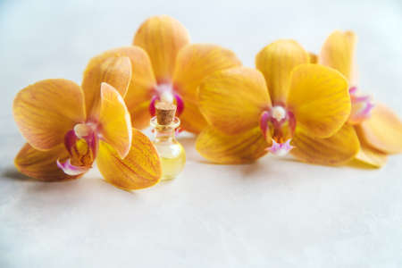 Orchid essential oil in a small bottle. Selective focus. Nature.