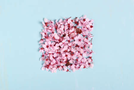 Perfume bottle on the background of pink cherry flowers. Beauty cosmetics, skin care. Top view, flat lay.