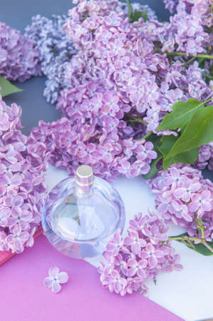 Violet color circle perfume bottle, template for presentation of perfume with lilac flowers