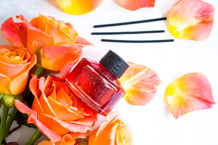 Flacon of perfume surrounded by dry buds of white roses. Presentation of cosmetic product. Aroma of flowers of toilet water