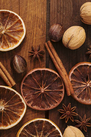 Dry spices for mulled wine with dehydrated sliced citrus on vintage kraft pack paper background. Winter oriental condiments such as dried lemon, clove, cinnamon and anise stars top view