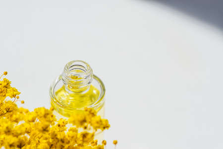Open transparent bottle without cap with serum or essential oil with beautiful yellow flowers in soft focus. White background with daylight and beautiful shadows. Beauty concept for face and body care