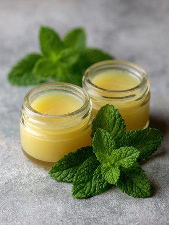 Two small jars filled with mint-infused balm are placed beside fresh mint leaves on a smooth gray surface, showing a blend of natural ingredients.