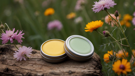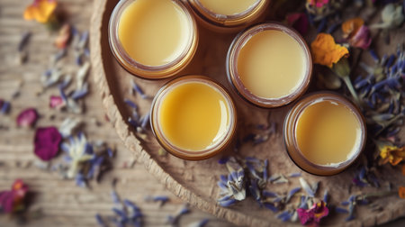 Organic homemade herbal salves displayed in small jars atop a rustic wooden surface with colorful dried flowers