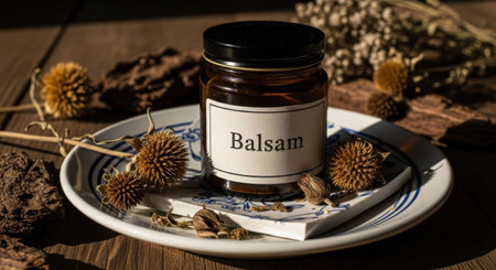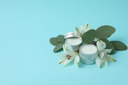 Glass jar of balsam with blank label on a white and blue plate. Natural product for health and beauty. Organic beauty industry.