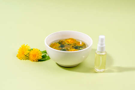 Dandelions (Taraxacum) in a bowl with boiling water and spray bottle with face toner. Home made beauty product. DIY soothing dandelion facial toner recipe. Natural beauty treatment.