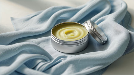 A round metal tin with an open lid reveals a creamy yellow balm, resting on soft light blue fabric in natural light. The image evokes themes of skincare, wellness, and organic self-care products, perfect for beauty, cosmetics, or aromatherapy branding.