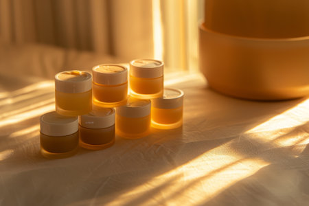 A row of small containers of lotion are sitting on a table. The containers are all different colors and sizes, and they are arranged in a neat row. Concept of organization and order