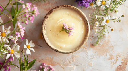 A bowl of smooth, natural cream topped with a delicate pink flower, surrounded by fresh wildflowers on a textured surface, creating a serene and botanical scene.