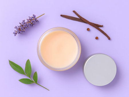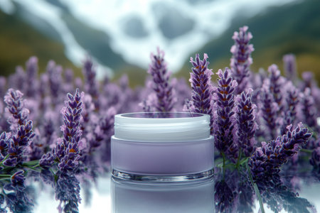 Skincare jar with lid off on purple mat. Decorated with lavender and leaves, this cream feels natural. Ideal for beauty or wellness images.
