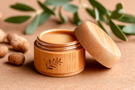 A neatly designed refillable container sits open, revealing creamy skin care product inside. The background has a natural, earthy feel with light textures.