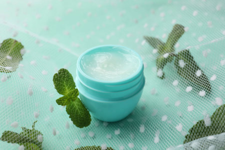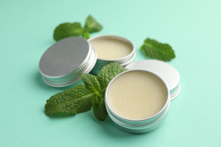 Natural lip balm, mint leaves and fabric on turquoise background, closeup