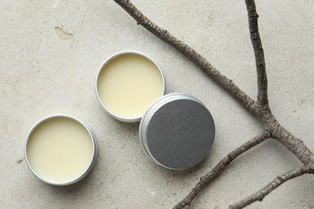 Natural solid perfume in containers and dry twigs on light table, flat lay