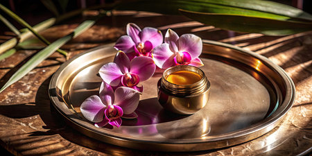 Spa still life with pink orchid flowers and cosmetic cream in golden jar