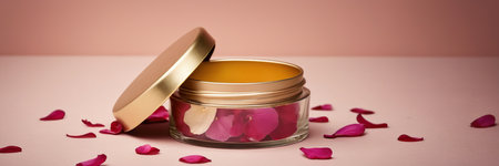 Glass jar of organic face cream with rose petals scattered around, evoking a sense of natural skincare and beauty