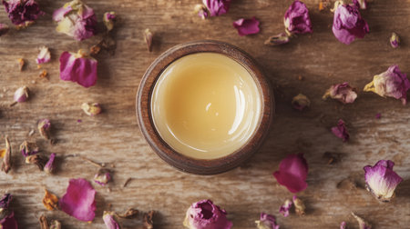 Natural rose-infused balm in wooden container surrounded by dried petals on rustic table