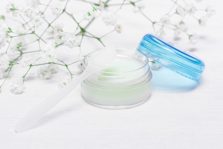 Natural face cream in a cosmetic jar on a blue background with white feathers Mock up Copy space