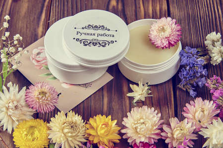 Handmade cream on a dark wooden surface surrounded by bright dried flowers. Healthy lifestyle, natural supplements. The lid says handmade.