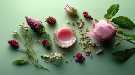 A serene composition featuring a jar of cream surrounded by vibrant flowers and herbs on a soft green backdrop, evoking a sense of natural beauty and tranquility.