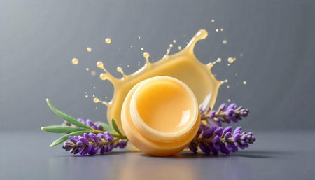 A serene and artistic image of a bright yellow cream jar floating in clear water, creating soothing ripples and reflections that evoke feelings of tranquility and wellness.