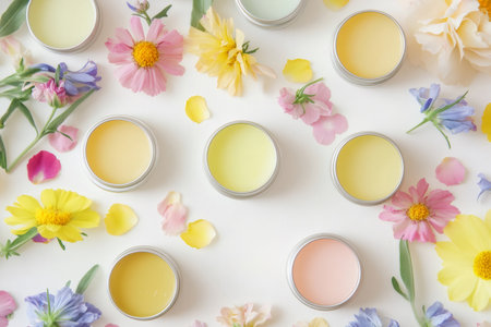 Round tins of natural lip balm surrounded by colorful flowers and petals on a white background, creating a pastel themed flat lay