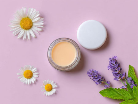 Cream jar with open lid on pink background. Surrounded by daisies, lavender, and mint, this natural skincare product looks fresh. Perfect for beauty or spa photos.
