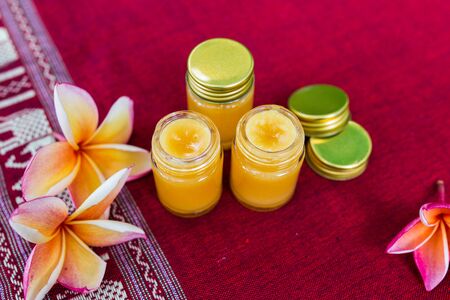 Bottles of homemade Thai herbal ointment. Concept, Thai local wisdom to use fragrant medicinal herbs to make inhaler and massage balm.