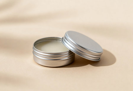 Open metal tin with solid moisturizing balm on neutral background illuminated by natural sunlight casting soft shadows.