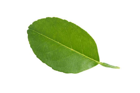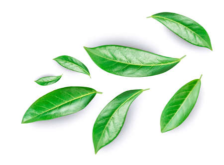 Green leaves with shade isolated on a white background. Creative layout with citrus leaf collection. Top view. Flat lay