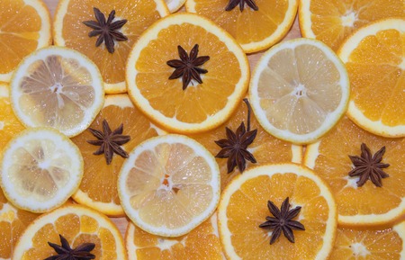 Slices of oranges arranged in a symmetrical pattern on a dark table, forming a striking food background