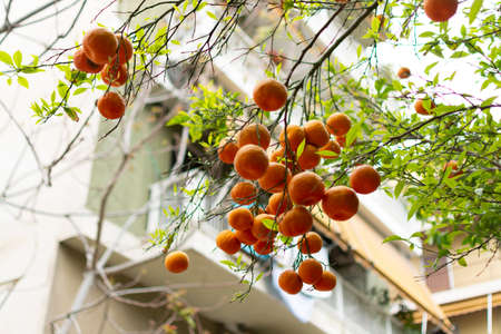 Ripe orange mandarine citrus fruit hanging on tree in Athens, Greece