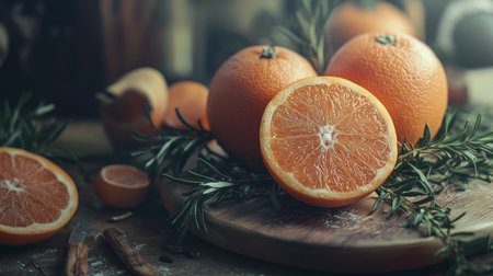 A cozy composition of whole and sliced oranges with fresh rosemary on a wooden table, evoking a natural and rustic feel.