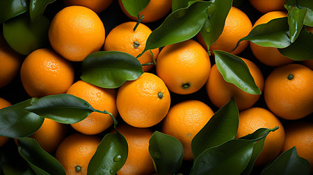 A captivating image showcasing a vibrant collection of juicy oranges nestled amongst lush green leaves. The image exudes freshness and is perfect for various food and lifestyle themes.